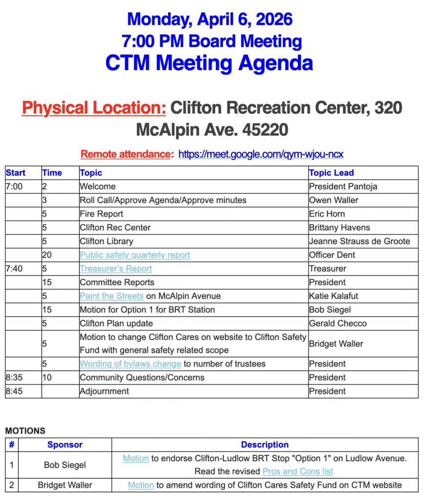 Clifton Town Meeting (CTM) is the recognized community council representing the Clifton neighborhood in the city of Cincinnati, Ohio. CTM sponsors and maintains this community website to provide information to residents, business owners, and visitors. Welcome!