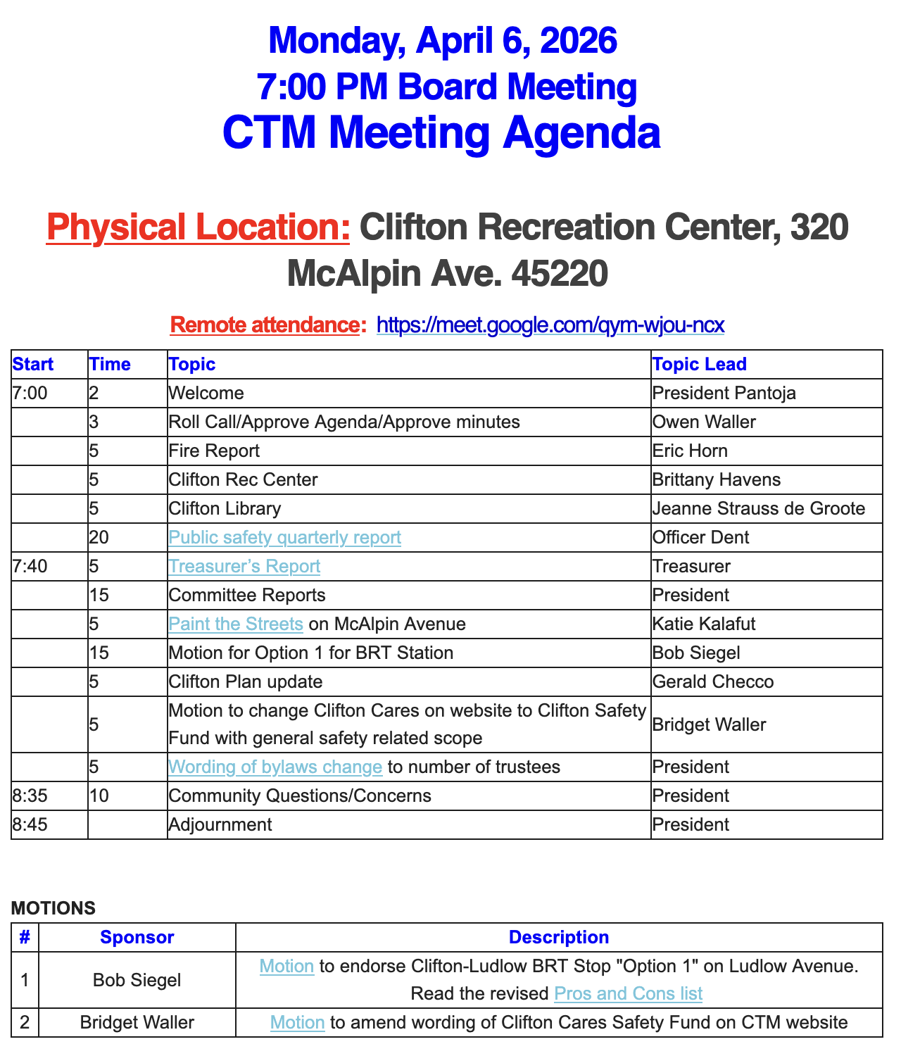 Community members may speak on non-agenda issues during the public questions and concerns period at the end of the meeting. Individuals with statements are asked to sign in before the start of the meeting. Such statements should last not more than two minutes and are invited during the public questions and concerns period. Email your request to speak (specify the topic), or to request an agenda item at the next meeting to contactctm@cliftoncommunity.org.